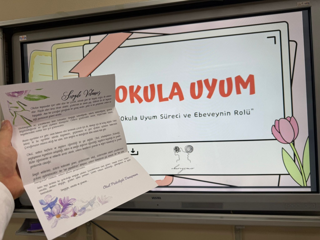 Okulumuz psikolojik danışmanları Baran YANARDAĞ TAŞTAN ve Esra KIPÇAK tarafından 18.09.2025 tarihinde okulumuz 1.sınıf öğrencisi velilerine “Okula Uyum ve Rehberlik Servisinin Tanıtılması” konulu seminer gerçekleştirilmiştir.